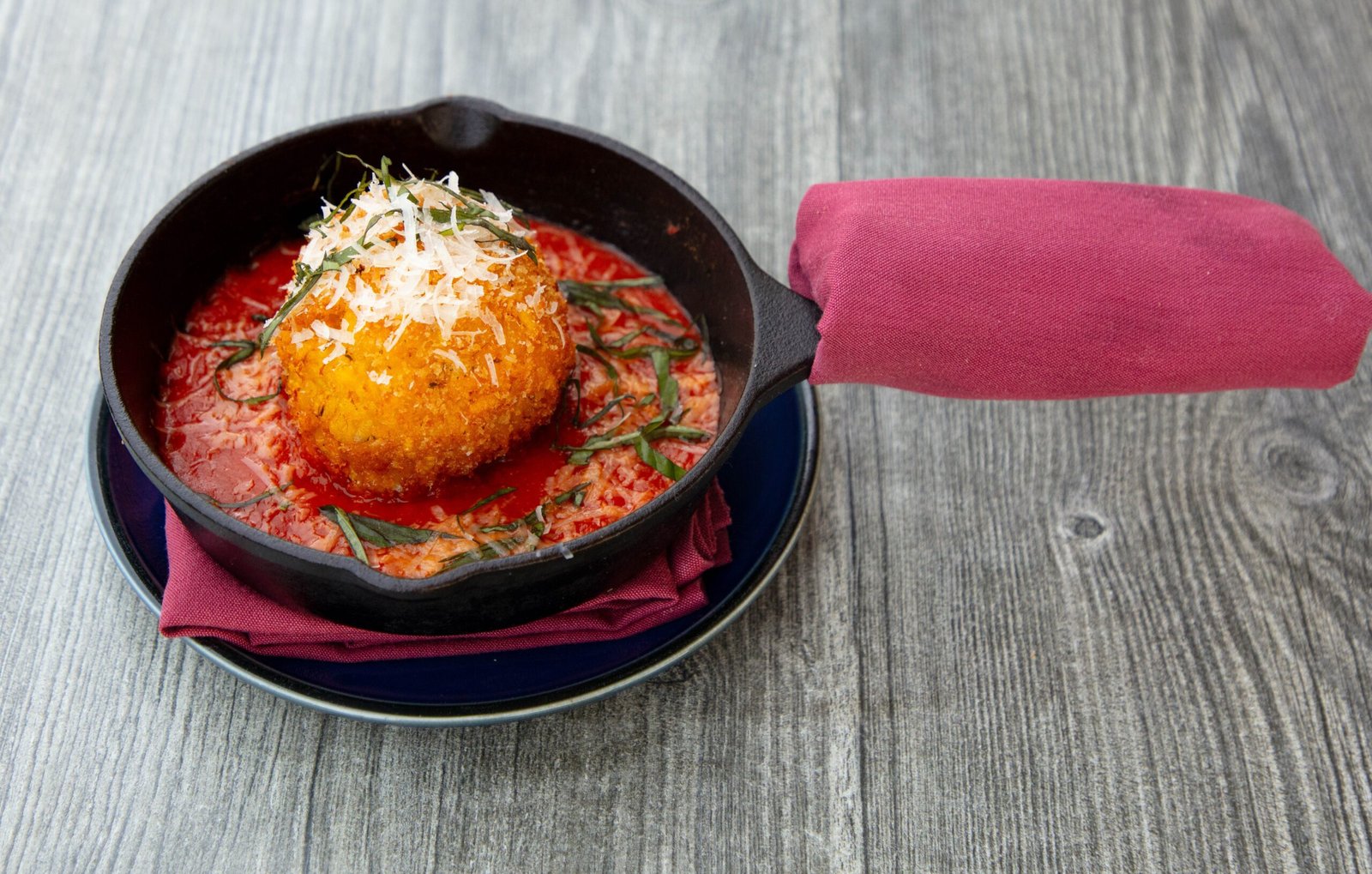 Saffron carnaroli rice ball that is stuffed with pomodoro sauce,...